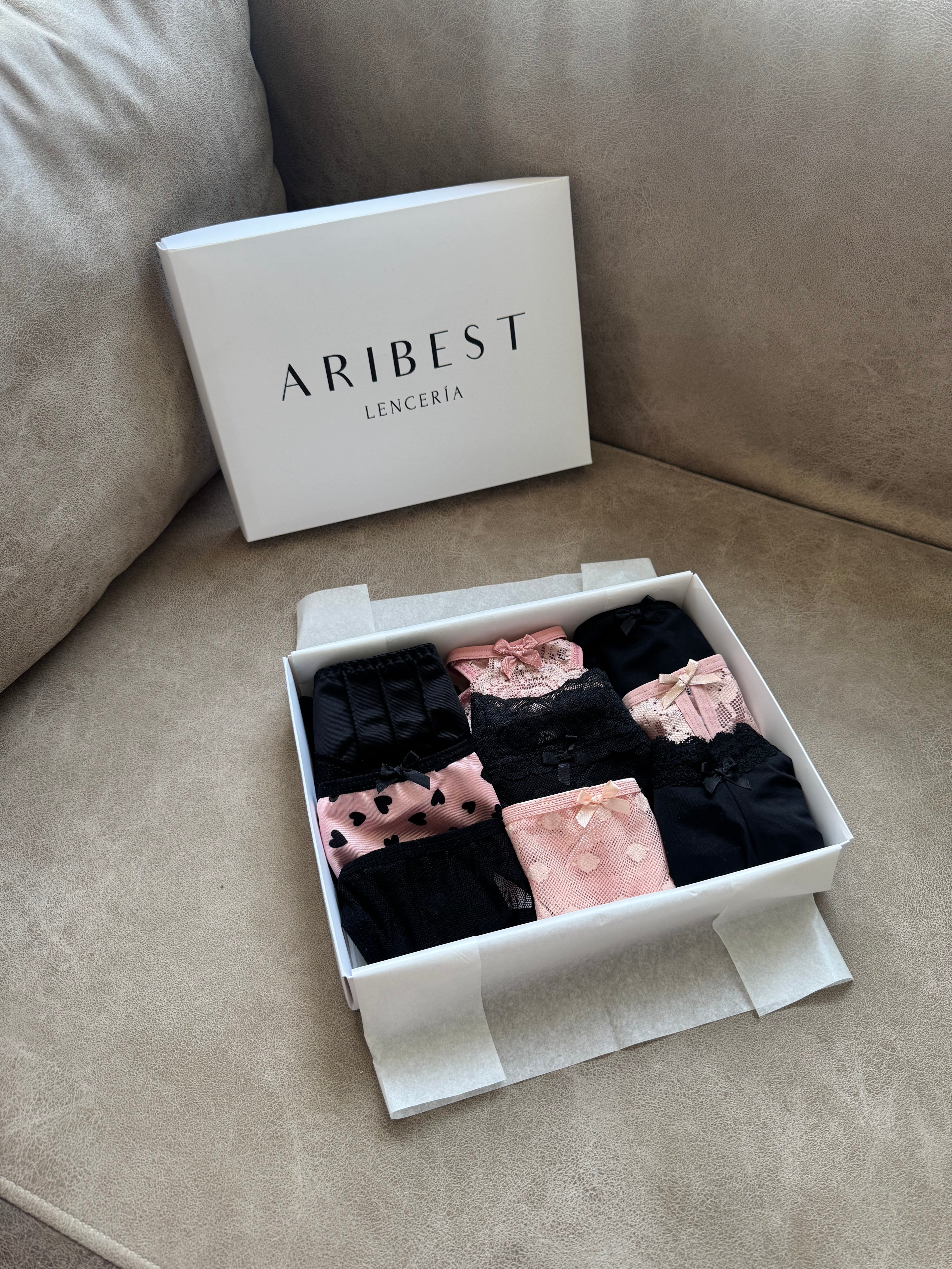 El balance de la ternura y la elegancia representados en esta cajita con bragas y tangas cómodas y creativas.
